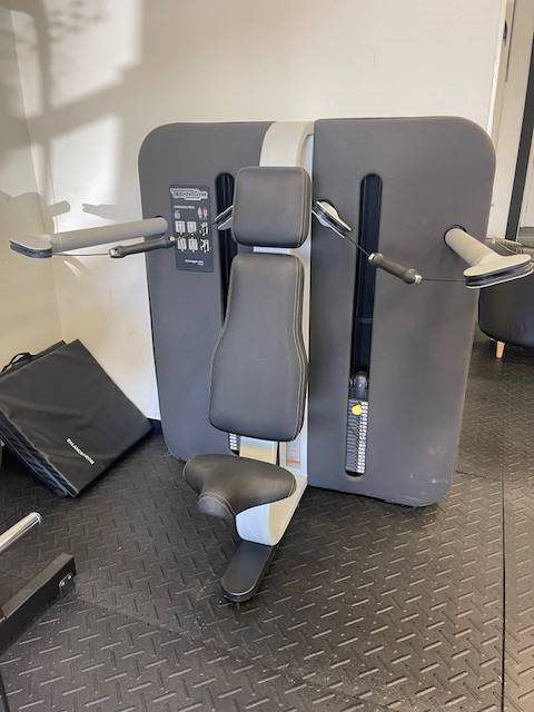 Kinesis cable resistance system; ergonomic seated press design; commercial durability.