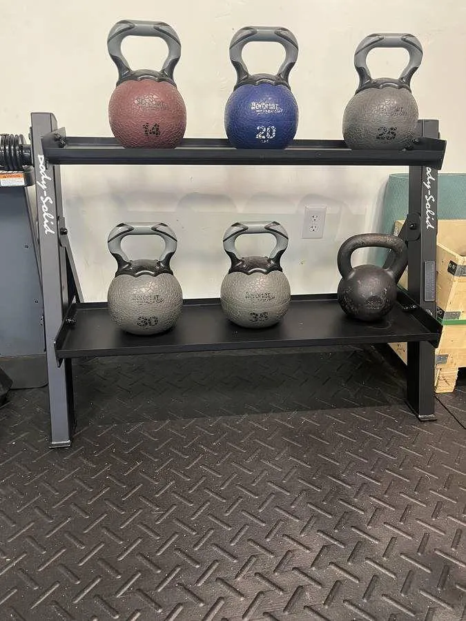 A brand-new commercial Body-Solid 3-tier kettlebell rack paired with a pre-owned 6-piece kettlebell set. This combo provides organized storage and versatile training tools ideal for strength, conditioning, and functional fitness workouts.