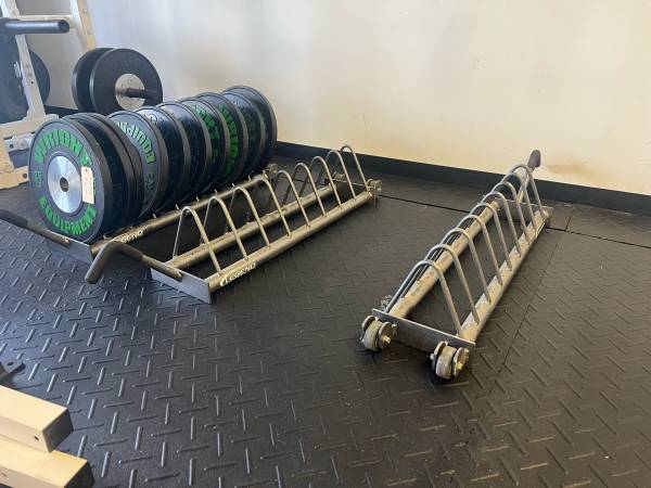 Heavy-duty steel frame; holds multiple Olympic weight plates; space-saving horizontal design; built-in wheels for mobility.
